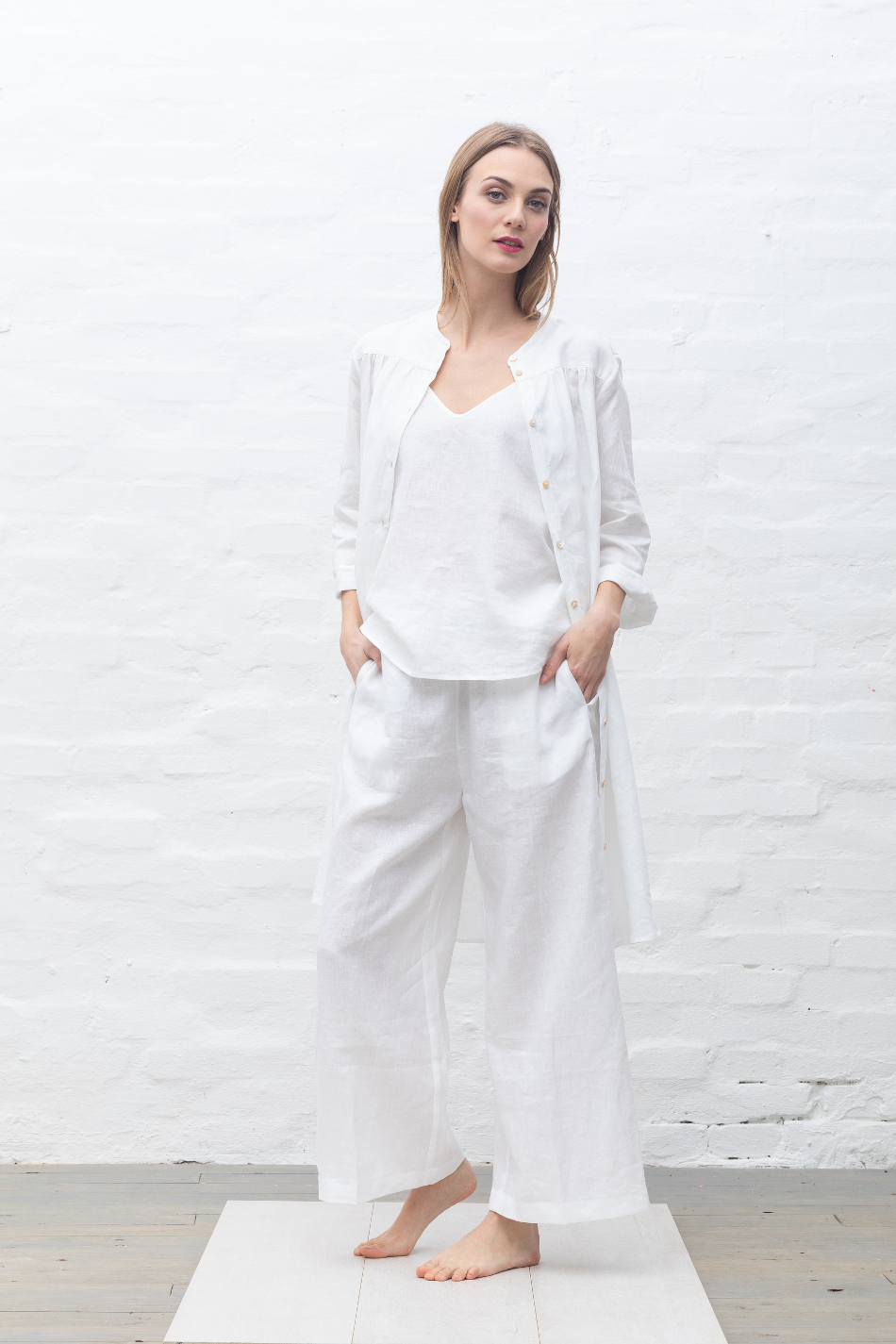 Quattro pezzi in lino naturale, candido e fresco.